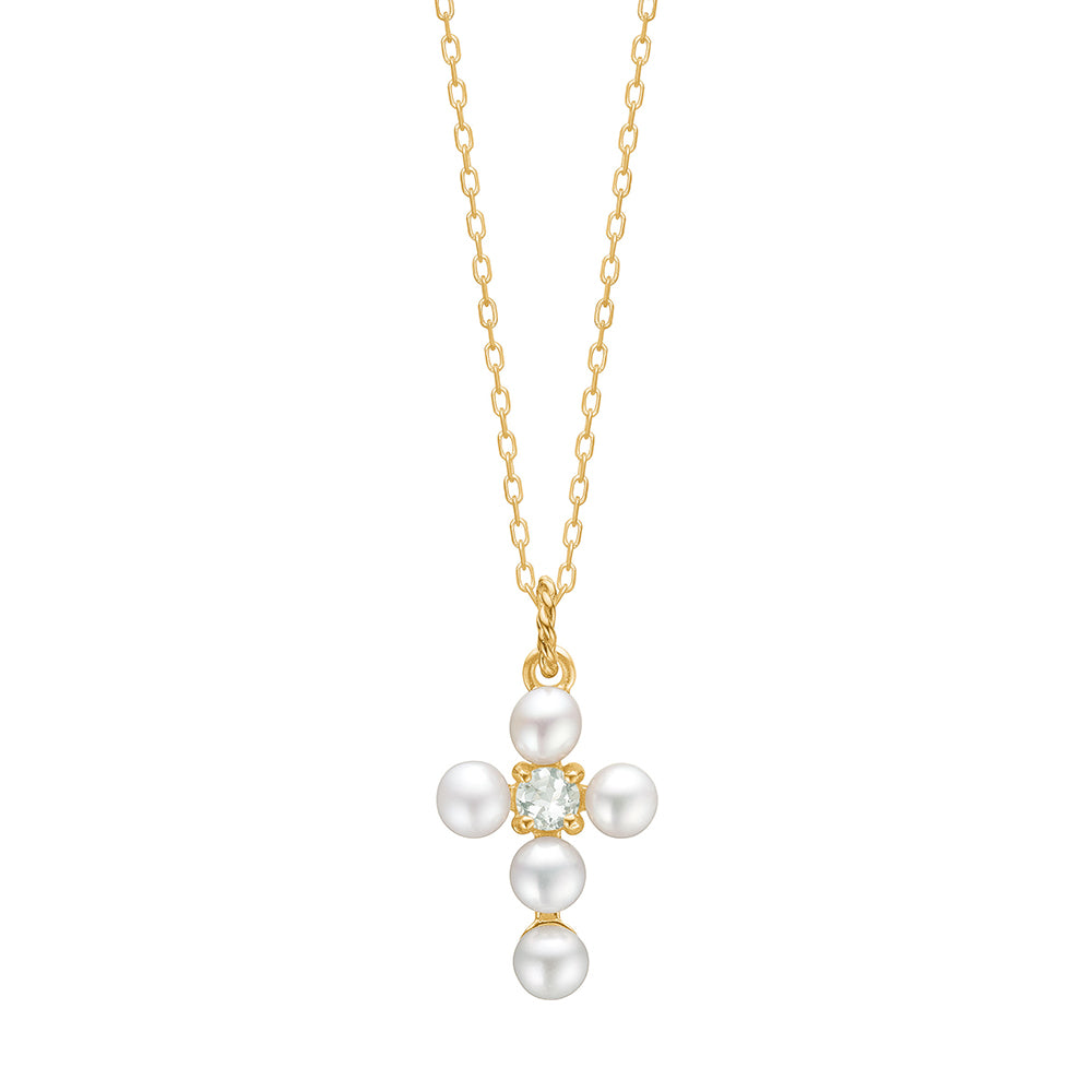 Vedhæng formet som et kors med facetslebet sten og hvide perler.  Vedhænget tilhører Reef kollektionen, inspireret af koralrevets formationer og eventyrlige havnymfer.