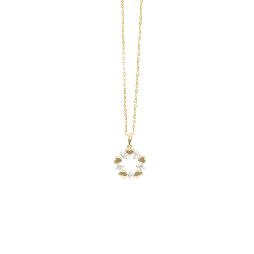 Denne smukke halskæde har et vedhæng i guld med små hjerter, adskilt af flotte, glinsende sten og en forgyldt sølvkæde at bære det i.