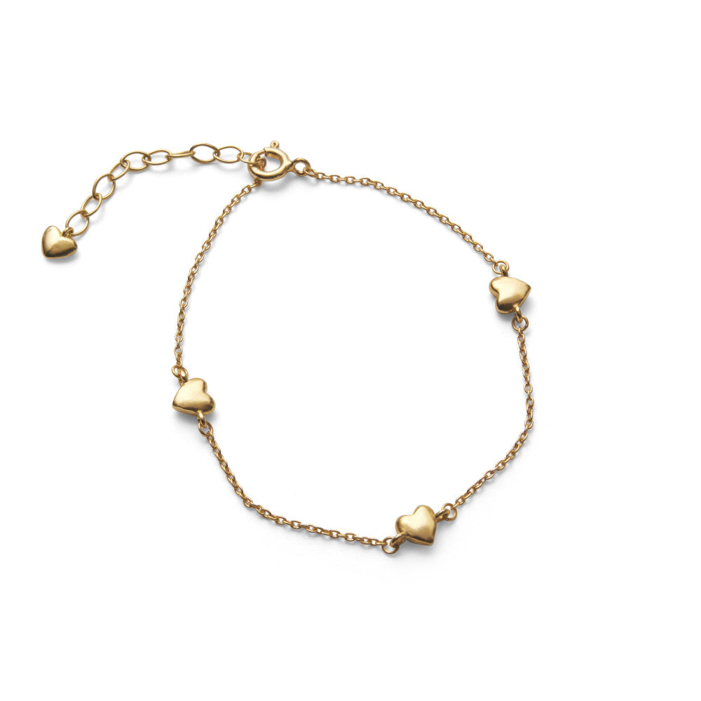 Adore Bracelet er et enkelt armbånd med tre små, chunky hjerter på kæden med et fjerde hjerte hængende ved lukningen. Fås i sølv eller forgyldt sølv.