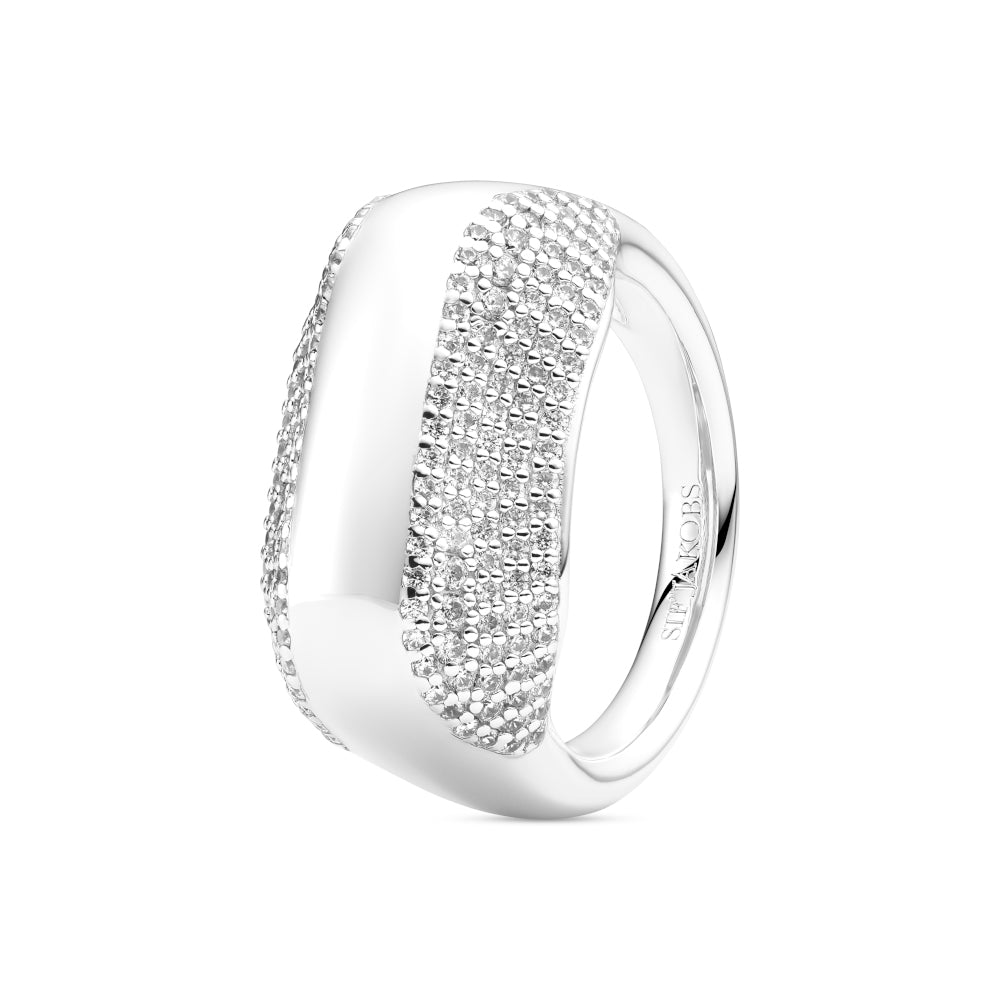 Ring i sølv eller forgyldt sølv med en poleret overflade og facetslebne hvide zirkoner.