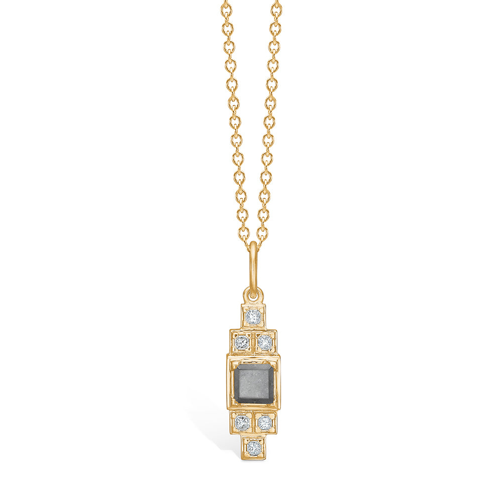 Smukt diamant vedhæng med en grå tavlesleben diamant og 6 prinsesseslebne hvide diamanter