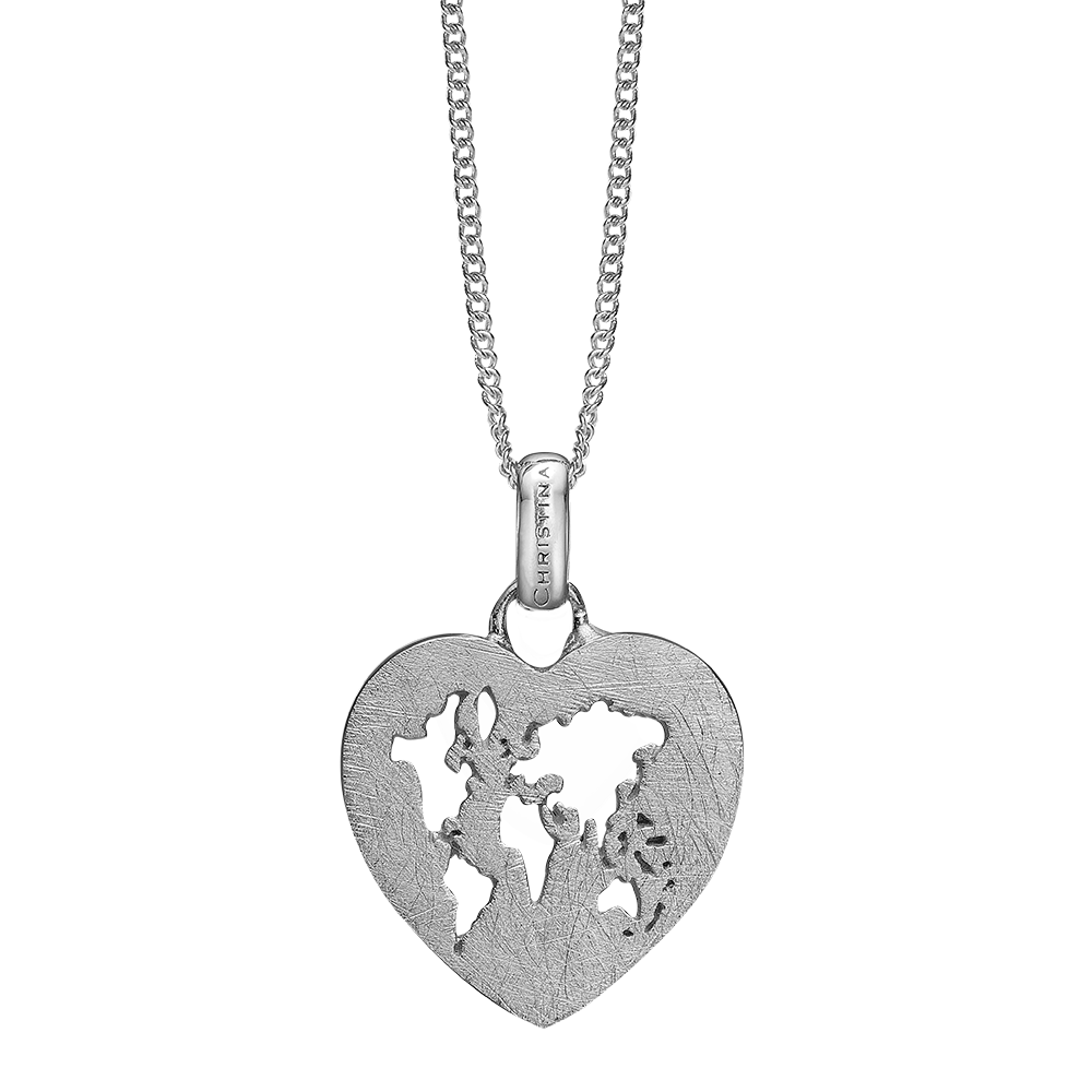 Halskæde med hjerte med verdenskort fra Christina Watches. Findes i både sølv og forgyldt sølv.